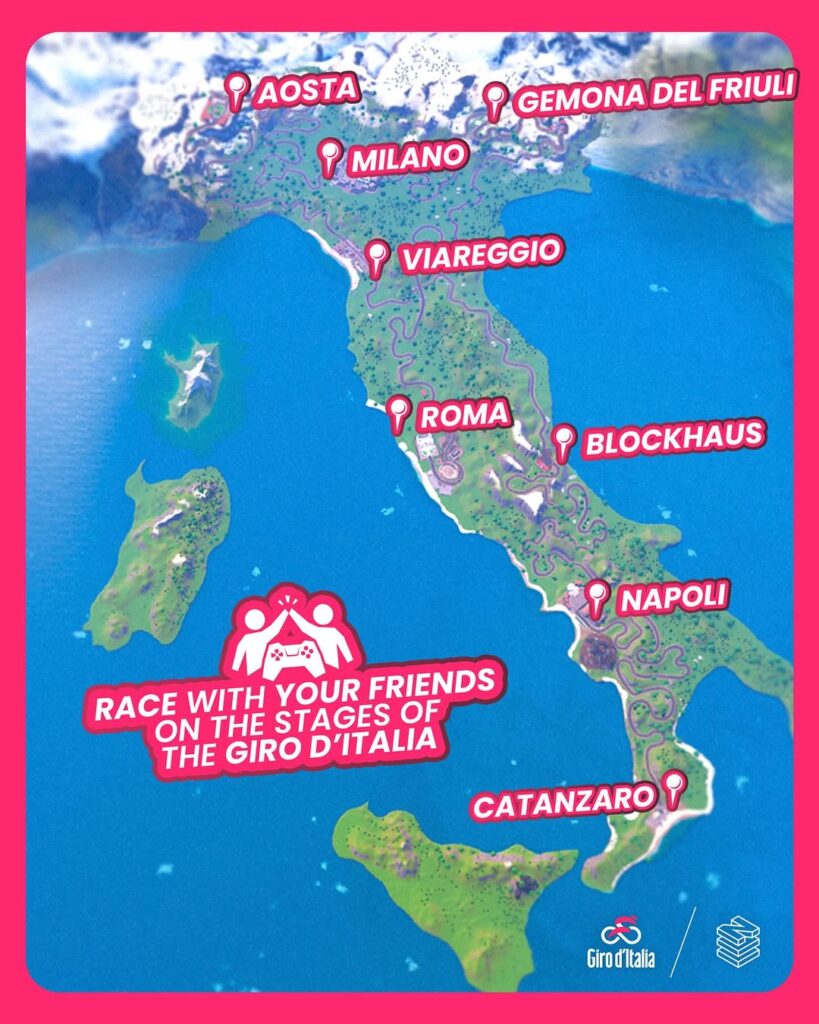 La propuesta se materializa a través de un mapa personalizado que recrea ocho etapas icónicas del recorrido oficial. Lugares como Catanzaro, Nápoles, el exigente ascenso al Blockhaus, Viareggio, Aosta, Milán, Gemona del Friuli y Roma se transforman en escenarios interactivos donde los jugadores pueden explorar, competir y vivir la esencia del Giro desde una perspectiva completamente innovadora.
