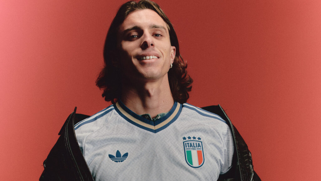 Las mangas, los logotipos y la numeración se completan con detalles en azul marino y dorado, mientras que un monograma inspirado en la palabra «italia» en la parte posterior del cuello celebra un estilo de bordado personalizado que simboliza la propiedad y la identidad.