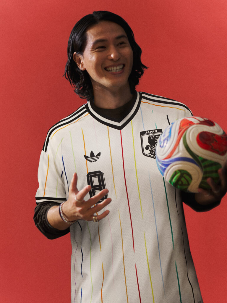 Inspirándose en los «Colores más allá del horizonte», el diseño de la equipación visitante de Japón cobra vida a través de un gráfico de rayas que presenta 12 colores distintos, que se combinan para representar la unidad y el vínculo de la nación, dentro y fuera del terreno de juego.