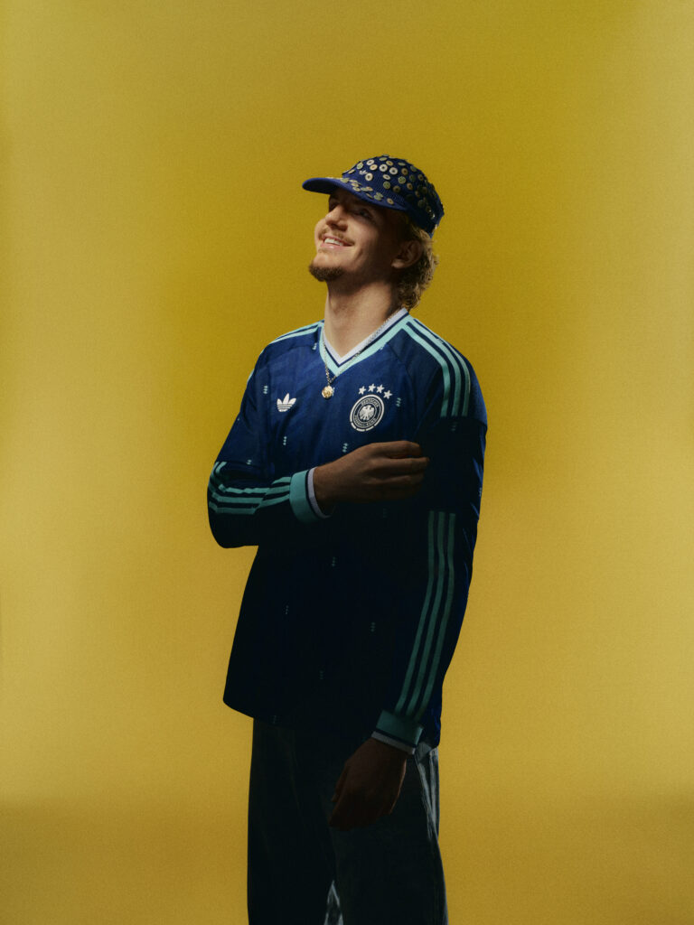 Siguiendo la estética de la equipación local, los chevrones diagonales se reinventan como un estampado integral en azul marino, formando una repetición rítmica de tres figuras entrelazadas. La paleta de colores combina tonalidades de distintas épocas de la historia de la DFB. Incluye un guiño a las clásicas sudaderas azules con cremallera de 1954, así como a las clásicas camisetas de entrenamiento azules y blancas de los años 60, 70 y 80, mientras que los detalles en azul turquesa hacen referencia a la llamativa ropa de entrenamiento de los años 90. Todo ello diseñado para crear un efecto visual impactante y potente.